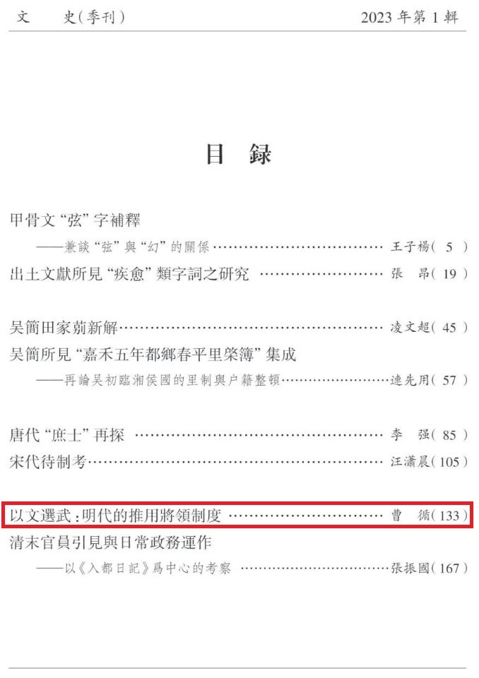 近日,我院曹循教授的长篇专题论文《以文选武:明代的推用将领制度》在《文史》2023年第1辑刊发,全文4万余字。